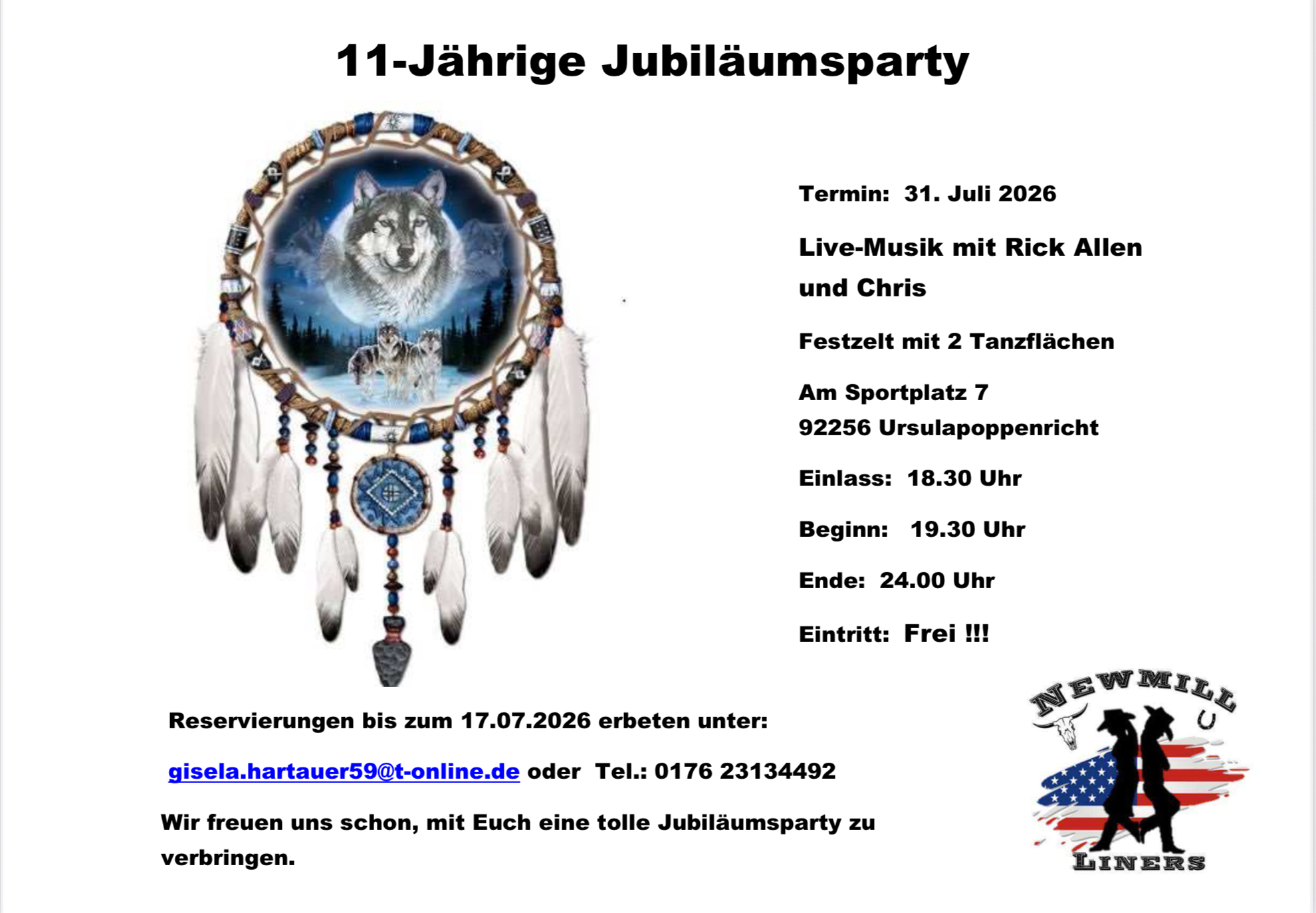 wir laden Euch alle recht herzlich zu unserer 11-Jährigen Jubiläumsparty im großen Festzelt mit 2 Tanzflächen und Live-Musik mit Rick Allen und Chris ein.