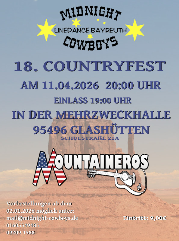 Einlass 19.00 Uhr Beginn: 20.00 Uhr mit der Countryband MOUNTAINEROS