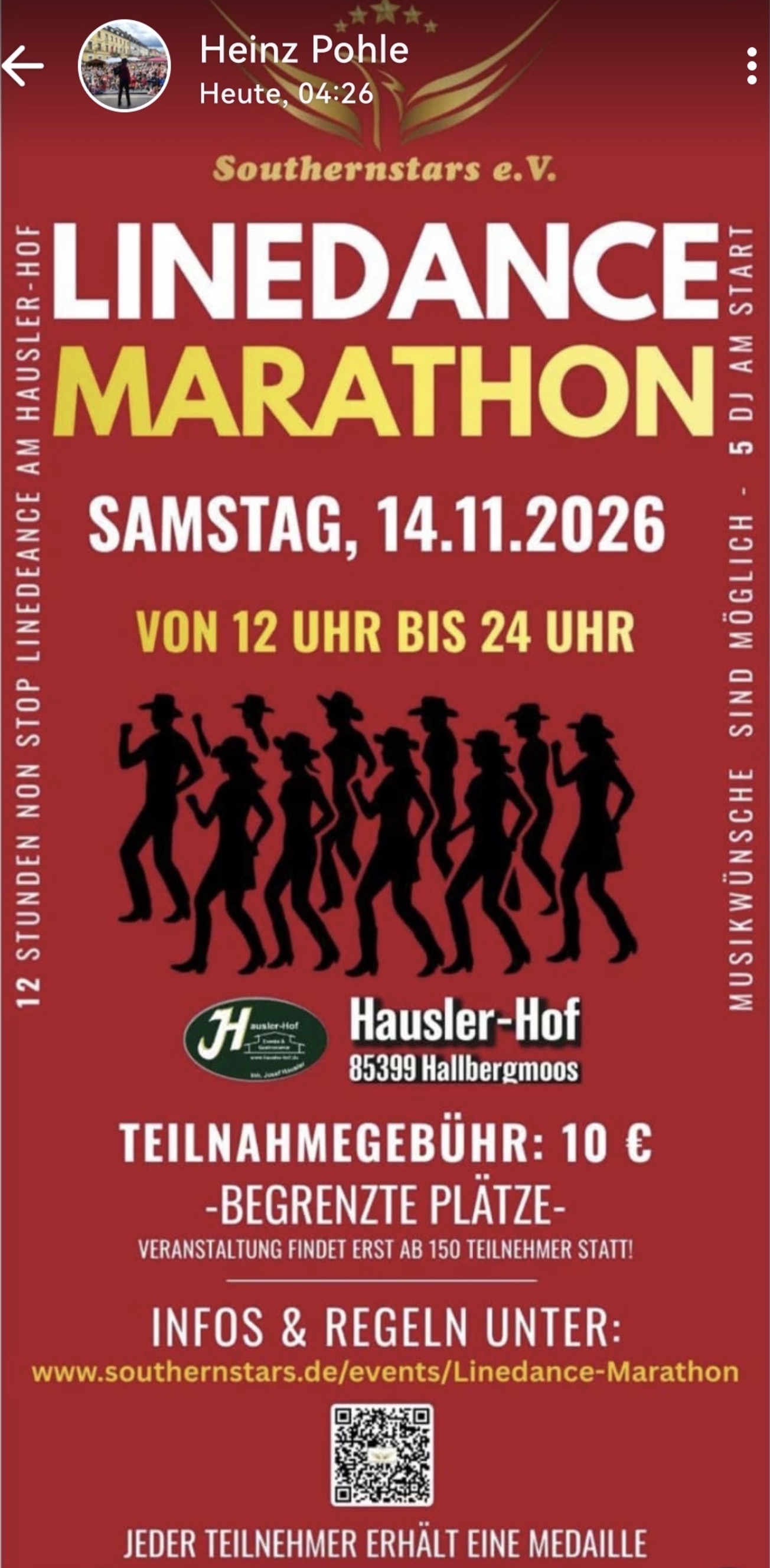 Der Southernstars e.V. veranstaltet am 14. November 2026 den ersten Line Dance Marathon in Bayern. Ihr könnt euch direkt bei den Southernstars oder aber über mich anmelden. Es wäre schön cool, wenn die Oberpfalz stark vertreten wäre.